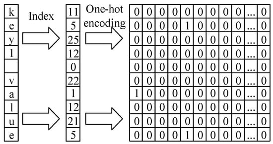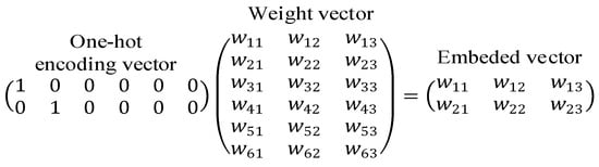 The Embedding layer is a fully connected neural network model specifically designed for text word embedding representation. Its structure is shown in Figure 4. For a given character , it is first encoded using one-hot encoding to obtain the corresponding character encoding vector. This vector is then input into the Embedding layer, which performs mapping calculations to convert it into a corresponding dense vector.