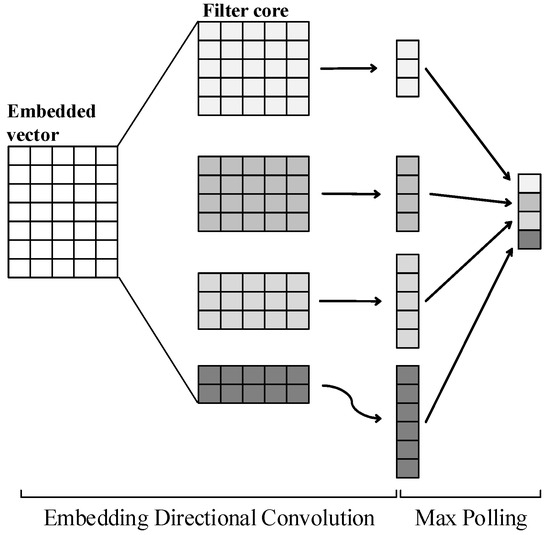 The model structure of this feature extraction method is shown in Figure 5. The model input is the embedding matrix of each field in the request packet. First, multiple convolutional kernels of different heights are used to perform convolution operations on the character embedding matrix, extracting multiple sets of local features. Then, max-pooling is applied to the results of each convolutional kernel to discard redundant features and retain the optimal local features. Finally, by concatenating the results processed by each pooling layer, the feature vector corresponding to the field is obtained.