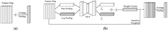 In the formula, represents the fully connected neural network, is the average pooling function, and is the max pooling operation. The two resulting vectors are added together and transformed using the sigmoid activation function to obtain the weight coefficient vector corresponding to each feature vector , as shown in Equation (8), where denotes the sigmoid activation function.