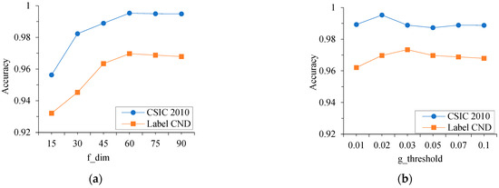This paper set the parameter to 0.01, 0.02, 0.03, 0.05, 0.07, and 0.1 as thresholds for statistical feature selection. Experiments were conducted on the CSIC 2010 dataset and the Label CND dataset to investigate the impact of the on the model’s detection results. The results are shown in Figure 8b above. It can be observed that the value of the significantly affects the model’s accuracy. On both the CSIC 2010 and Label CND datasets, as the increased, the accuracy of the detection model first rose and then declined. This is because when the is too small, more irrelevant features are included as input to the detection model, negatively impacting its performance. Conversely, when the is too large, some valuable statistical features are filtered out, leading to an incomplete representation of the attack characteristics of malicious requests. Therefore, in the CSIC 2010 dataset, the was set to 0.02, where the model’s detection rate reaches its peak, corresponding to the selection of eight statistical features. In the Label CND dataset, the was set to 0.03, where the model achieved the highest accuracy, corresponding to the selection of 13 statistical features.