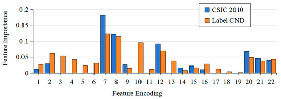 For the statistical features of HTTP requests, our paper first calculated the importance scores of each statistical feature on the CSIC 2010 dataset and the Label CND dataset, as shown in Figure 9 below. On different datasets, due to the composition of the anomaly attack types and the specific forms of the anomaly attacks, varying degrees of feature importance are displayed. For example, the ‘param_len’ of abnormal attacks on the CSIC2010 dataset is significantly longer than normal samples compared to the CND dataset, making it easy to distinguish samples from the CSIC2010 dataset through the ‘param_len’ parameter, resulting in high feature importance.