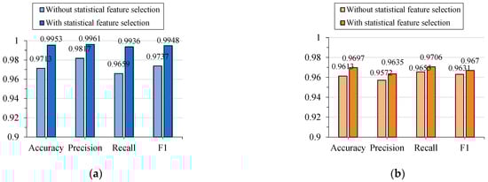 Performance analysis of statistical feature selection methods on different datasets. (a) HTTP CSIC 2010 dataset; (b) Label CND dataset.
