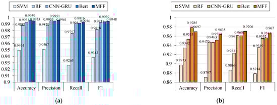 Finally, to further validate the detection effectiveness of the proposed method, this paper selected the research methods from refs. [15,30,31,32] for comparative experiments on the CSIC 2010 and Label CND datasets. The experimental results are shown in Figure 12 below. Among them, SVM [30] and TF-IDF [15] are traditional methods, while CNN-GRU [31] and Bert [32] are relatively novel methods.