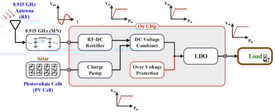 This study presents a hybrid energy-harvesting chip that combines an ISM-0.915-GHz RF energy acquisition system with a solar photovoltaic cell. A CCDD rectifier is employed to convert the RF signal into DC voltage. The input solar voltage is then boosted from 1.0 to 1.8 V using a Dickson charge pump. A DC voltage combiner is used to combine the RF energy with solar energy. An OVP circuit is connected at the rectifier’s output to protect the LDO and to limit the output voltage to within 3.6 V. Finally, an LDO is utilized to ensure a stable output voltage of 3.2996 V. The simulation results indicate that the RF rectifier circuit achieves a maximum power conversion efficiency of 41.6% and a steady output voltage of 3.2996 V. This study demonstrates the effectiveness of the proposed HEHS in efficiently harvesting and managing RF and solar energies. Its potential applications include charging low-power devices such as IoT devices, wearable electronics, and biomedical systems []. Future work will focus on integrating the RF energy-harvesting system with advanced conversion techniques, including maximum power point tracking (MPPT), dipole antenna arrays, rectenna arrays, and harmonic-based applications.
