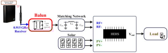 The RF antenna only transmits a single-ended signal; therefore, a balun converts the received single-ended signal into a differential signal. Figure 2 highlights the position of the balun used in the HEHS: between the antenna and the matching network. A loss of conversion efficiency of approximately 10% is incurred at the balun (Figure 2). Furthermore, the input impedance is prone to variations because of the microstrip line and also because the balun is expected to provide information on the impedance ratio. The actual impact of the balun on the chip must be measured online, and the simulated input impedance of the antenna must be 50 Ω.