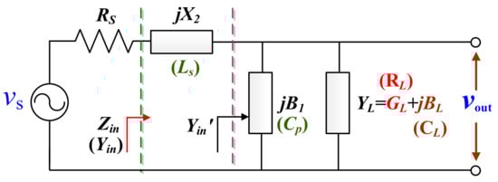 where jX2 and jB1 represent the impedance of the series inductor (Ls) and the susceptance of the parallel capacitor (Cp), respectively, in the L-section matching network. Similarly, GL and jBL denote the conductance of the parallel resistor (RL) and the susceptance of the parallel capacitor (CL), respectively, in the load.