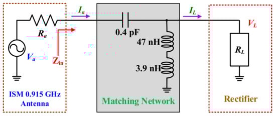 Figure 4 illustrates the matching network, which is located between the antenna and the N-channel metal–oxide–semiconductor (NMOS) rectifier. The impedance of the Industrial, Scientific, and Medical (ISM) 0.915-GHz antenna is approximately 50 Ω, whereas the input impedance of the three-stage modified NMOS rectifier is equal to 50 × (0.427 − j × 3.102) Ω. A matching network of (28.71 − j × 154.2) Ω is added to guarantee that the input impedance Zin of the rectifier with the matching network is approximately 50 Ω. The matching network, composed of an inductor (LQG15HS_02, Murata Manufacturing) and a capacitor (GRM15, Murata Manufacturing), is simulated using ADS software (2023 Product, Keysight, Santa Rosa, CA, USA).