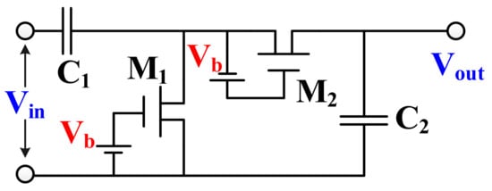Figure 5 illustrates an external Vth cancellation rectifier circuit whose conversion efficiency has been increased by adding a critical voltage Vb between the gate and drain terminals of the transistor []. The output voltage Vout can then be expressed as follows: