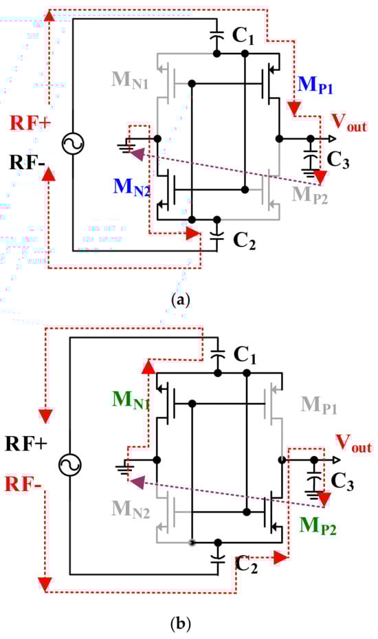 Figure 7 shows a single-stage cross-coupled differential drive (CCDD) rectifier circuit [], which is composed of the CMOS full-wave bridge rectifier and the circuit for the self-cancellation of Vth. The advantages of the proposed CCDD rectifier (CCDDR) are that the input signal can be utilized effectively in each cycle, and the critical voltage can be reduced. When the RF+ terminal is connected to a high-level signal and the RF− terminal connected to a low-level signal, the transistors MP1 and MN2 conduct electricity not only to provide a charging current from RF+ to RF− but also to increase the output voltage Vout (Figure 8a). Conversely, when RF− is at a high potential and RF+ at a low potential, the transistors MP2 and MN1 conduct electricity to provide a charging path from RF− to RF+, thereby increasing the output voltage Vout. C1 and C2 are used as voltage compensation for the transistor gate, and C3 is a regulated capacitor that supplies a stable voltage to the Vout terminal (Figure 8b).