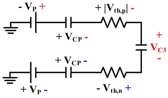 Figure 9 depicts the equivalent circuit when RF+ is positive for a half-cycle. The peak voltages of the RF+ and RF− signals, the capacitance voltages of C1 and C2, and the required minimum voltages of PMOS and NMOS are represented as +Vp, −VP, +VCP, −VCP, |Vth,p|, and Vth,n, respectively. According to Kirchhoff’s voltage law, the charged voltage of VC3 can be expressed as follows: