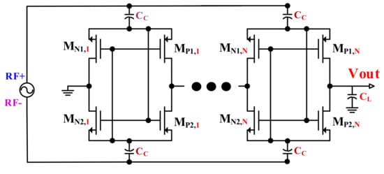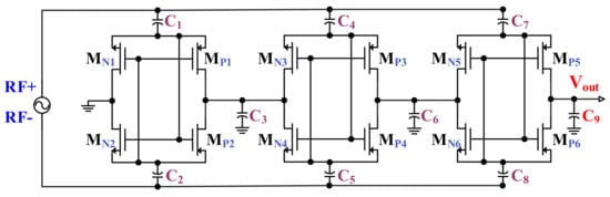 This study employs a three-stage CCDD rectifier circuit having six NMOSFETs and six PMOSFETs (in Figure 11) []. The circuit contains six nominal N-type transistors and six nominal P-type transistors in the diode-connected form as well as nine metal–insulation–metal capacitors. All transistors and capacitors are identical. The bottom plate, marked with a bold line, exhibits a large parasitic capacitance and is grounded to reduce loss. If the RF signal is received through the ISM-0.915-GHz antenna, it is fed into the CCDD rectifier through the balun and impedance matching network. The load capacitor C9 of the third CCDD rectifier stores enough DC voltage to complete signal conversion and suppress ripple voltage [].