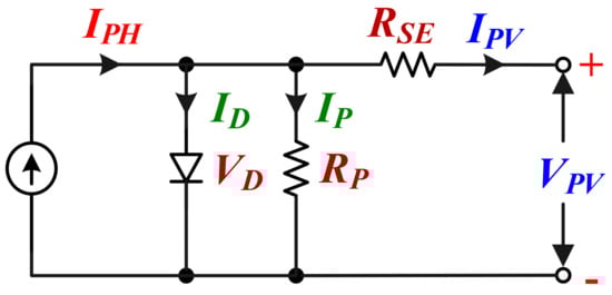 A photovoltaic cell, commonly called a solar cell, is a semiconductor device that converts sunlight directly into electricity. Figure 12 illustrates a photovoltaic cell composed of two semiconductor layers: an N-type layer with an abundance of electrons and a P-type layer with an abundance of holes. Incoming photons strike the photovoltaic cell and are absorbed, resulting in the excitation of electrons in the N-type layer and their migration across the junction to the P-type layer. The movement of electrons toward the front surface of the photovoltaic cell creates an imbalance of electrical charge between the front and back surfaces of the cell, resembling the negative and positive terminals of a battery and creating a voltage potential. Electrical conductors on the photovoltaic cell absorb the electrons. When these conductors are connected in an electrical circuit to an external load, such as a battery, electricity flows through the circuit []. Figure 13 shows the most popular equivalent circuit of a solar photovoltaic cell. It includes a current source IPH, one diode with voltage VD and current ID, and two resistors: one in series (RSE) and one in parallel (RP) []. Multiple photovoltaic cells can be connected in parallel or in series to increase the output power and voltage. Solar panels differ in terms of their manufacturing technology and the corresponding efficiencies. The conversion efficiency of the solar panels available in the market ranges from 16% to 23%. This study used the poly-passivated emitter (Poly PERC, Shajing, Shenzhen, China) and rear contact solar panel, which has a lower conversion efficiency than the N-type-integrated back contact panel.