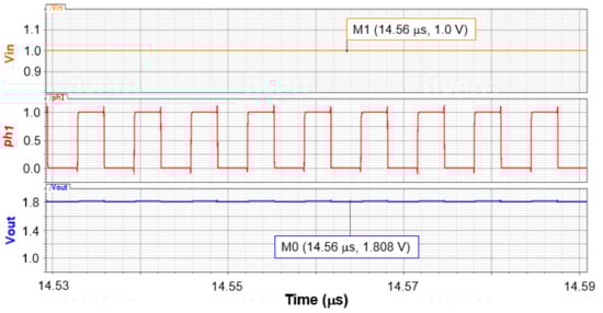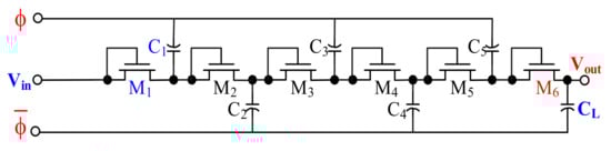 Figure 14 displays a schematic of the Dickson charge pump employed in this study. This pump not only enhances the input power of the solar cell but also generates the required output voltage through multiplication. The N-type MOSFET is configured in a diode-connected form. During the charging phase, the input voltage Vin is supplied to the first stage of the charge pump to charge the first capacitor C1. In the transfer phase, C1 retains its voltage, and the second capacitor C2 gets charged. In the next cycle, the charging process is repeated, and the stored voltage is increased. Finally, the output voltage Vout is obtained from the last load capacitor CL [].