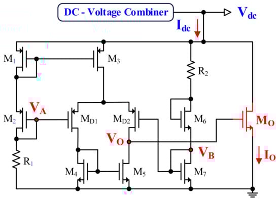 where VODi, Vth,ni, and Vth,pi represent the overdrive voltage of the ith MOSFET, threshold voltage of the ith NMOS, and the threshold voltage of the ith PMOS, respectively. Initially, the two bias voltages were identical (i.e., VA = VB). The DC output voltage of the DC voltage combiner can be expressed as follows: