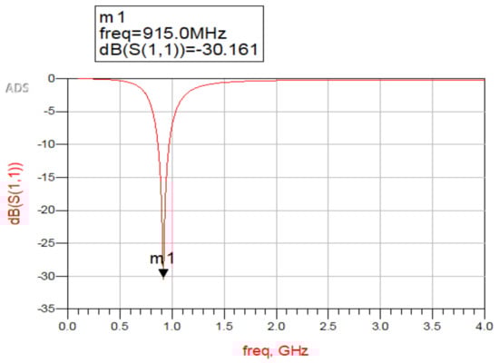 As shown in Figure 4, a matching network of (28.71 − j × 154.2) Ω is added to the system to guarantee that the input impedance Zin of the rectifier is approximately 50 Ω. The matching network was simulated using ADS software. Figure 19 illustrates the parameter S11 of the matching network. The input return loss S11 at the center frequency of 0.915 GHz is approximately −30.161 dB, lower than −25 dB. The simulated input return loss satisfies the required specification.