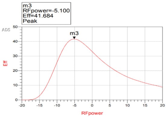 As shown in Figure 11, the RF input signal is received through the ISM–0.915–GHz antenna and fed into the three–stage CCDD rectifier through the balun and matching network. Let us regard the input RF signal as a cosine waveform (i.e., RFin = VP cosωt, with a peak amplitude VP and an input frequency f = ω/2π = 1/T). The load capacitor C9 stores enough voltage to complete the signal conversion and suppress the ripple voltage. When the rectifier circuit operates in a positive half–cycle (t = 0, T, 2T, …), the transistors MP1, MN2, MP3, MN4, MP5, and MN6 conduct electricity, and the forward current flows into C3, C6, and C9. The DC output voltage Vout is obtained at C9. When the rectifier circuit operates in a negative half–cycle (t = T/2, 3T/2, …), the transistors MN1, MP2, MN3, MP4, MN5, and MP6 conduct electricity, and a backward current flows into C3, C6, and C9. An output voltage Vout is obtained at C9. The conversion efficiency of the differential three-stage CCDD rectifier circuit is twice that of a single-ended rectifier circuit. All transistors and capacitors continue to operate as described above regardless of the number of stages of the voltage doubler and rectifier. If the number of stages is three, the approximate output voltage is calculated as follows: Vout = 6 × VP − 3 × (|Vth,p| + Vth,n) (V). Figure 20 shows the simulated conversion efficiency of the adopted differential three-stage CCDD rectifier circuit. The maximum conversion efficiency was approximately 41.68% at an input RF power of −5.1 dB.