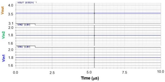 Furthermore, a Dickson charge pump is utilized to boost the input power of the solar cell and to generate the required output voltage through multiplication. Figure 21 presents the simulation results of operating a Dickson charge pump. When the input voltage is approximately 1.0 V, the output voltage is approximately 1.8 V at a phase frequency of 150 MHz. Next, a DC voltage combiner is used to merge the outputs of the two sources, namely, RF energy and solar energy. The output voltage (Vo), given by the sum of the weighted input voltages, is determined from Equation (14). Figure 22 shows the simulation results of operating a summing amplifier. If the output voltages of both RF and solar power are 1.8 V each, they can be combined using the summing amplifier to yield a combined output voltage Vo of approximately 3.552 V at identical resistances (Rf = R and R1 = R2).