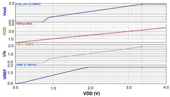 Finally, an LDO is employed to obtain a stable and clean output voltage with low power loss and low power consumption. Figure 24 shows the simulated output voltage of an LDO. In this simulation, the reference voltage VREF is approximately 1.75074 V, and the feedback voltage VFB is approximately 1.74286 V. The LDO circuit generates a steady output voltage of approximately 3.2996 V.