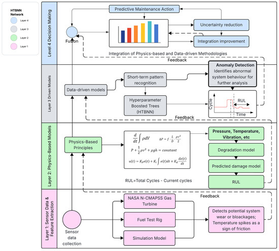The hybrid methodology employs the temporal breakdown of sensor signals into high- and low-frequency components using wavelet transforms or moving average filters. The physics-based model is utilised for the smoothed, long-term trend data, whereas the HTBNN is trained on the residual or high-frequency signal. The ultimate RUL forecast is generated by integrating the outputs, establishing a multi-resolution prognostic framework.