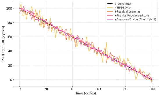 The hybrid model computes the final RUL prediction as a weighted combination of outputs from the physics-based model and the HTBNN. This fusion is defined in Equation (3) as follows: