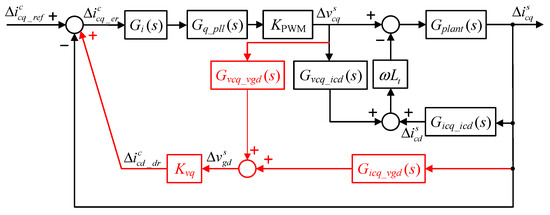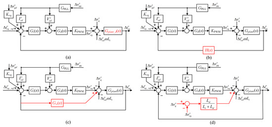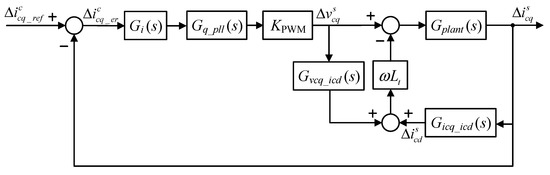 Therefore, the STATCOM state–space model considering grid impedance effects can be obtained as shown in Figure 2a. Here, and represent the d axis and q axis components of the small-signal perturbations in the STATCOM output current, respectively, and denote the d axis and q axis components of the small-signal perturbations in the STATCOM reference current, respectively; and are the d axis and q axis components of the steady-state STATCOM output current, respectively, and correspond to the d axis and q axis components of the small-signal perturbations in the PCC voltage, respectively. denotes the disturbance quantity in the output voltage of the phase-locked loop. The current controller is denoted by , whilst represents the linearized control delay [39]. represents the transfer function of the to [40], which is expressed as