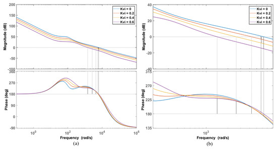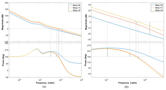 First and foremost, it is crucial to clarify the modifications induced by the incorporation of droop control into the system. The comparative analysis of Figure 3 and Figure 4 reveals that the implementation of droop control essentially introduces a positive feedback loop whose gain is regulated by the droop control coefficient . To quantitatively demonstrate the impact of this feedback path on system, Figure 5 presents the Bode diagrams of the system’s open-loop transfer function under varying values.
