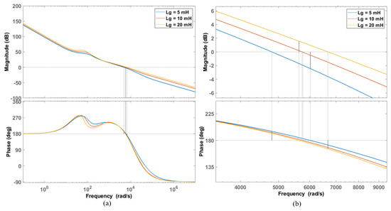 The method proposed in this paper does not alter the circuit topology; hence, the system impedance remains . Consequently, the control part is modified to achieve the same effect as an actual inductor. First, a new feedback loop is added to the original control system, as shown in Figure 9b. Thus, the transfer function from to is given by