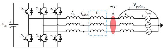 As demonstrated in Figure 1, the primary system schematic and control scheme of STATCOM comprises a DC-link voltage , a three-phase grid-connected inverter, and three filter inductances . It is noteworthy that the subscripts a, b, and c denote three-phase quantities. In the context of this study, the weak grids are modeled as a connection series of an ideal grid voltage and a grid inductance Lg. It is imperative to emphasize that, in scenarios characterized by weak grids (large Lg), as indicated by substantial values of Lg, the voltage drop across Lg becomes pronounced and cannot be disregarded. This results in a substantial discrepancy between the measured PCC voltage and the ideal grid voltages . As illustrated in Figure 1, the system’s control scheme is implemented in the synchronous -frame.