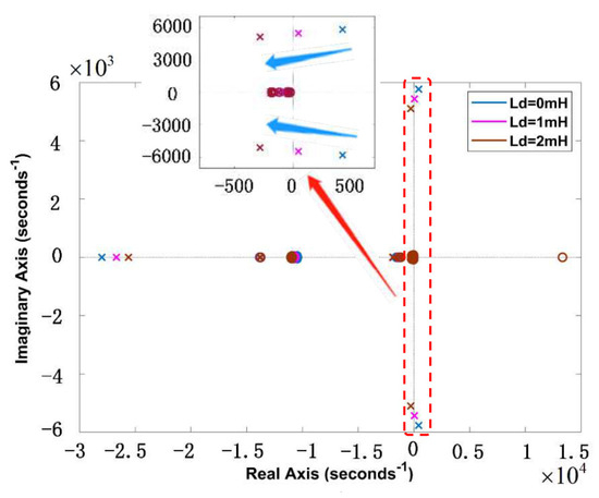 A closer examination of Figure 4 reveals that the droop control introduces two transfer functions, denoted as and , which are mathematically defined by Equations (18) and (19), respectively. Both functions incorporate the grid inductance parameter and exhibit proportionality to . This relationship explicitly elucidates the mechanism through which the droop control method interacts with grid impedance, with such an interaction directly contributing to stability challenges. When , corresponding to a strong grid condition, both and become zero, rendering the droop control entirely ineffective in modifying the system transfer function. As previously discussed, this droop control strategy becomes unnecessary for grid voltage support under non-weak grid conditions. Figure 6 quantitatively demonstrates the impact of on system stability, where increased values correlate with heightened instability risks. These observations underscore the necessity for developing stability-enhancing methodologies tailored for droop-controlled systems operating in weak grid environments.