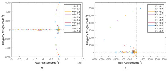 Continuing the analysis, the pole-zero map of is plotted, as shown in Figure 8. As seen in Figure 8, as increases, the unstable poles initially in the right half-plane move to the left, and the system transitions from unstable to stable.