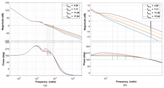 Figure 10 demonstrates that the introduction of virtual impedance reduces the system bandwidth, consequently impairing dynamic response performance. As indicated by Equation (9), PLL parameters constitute another critical factor affecting system performance, where PLL bandwidth significantly influences the dynamic response characteristics. Figure 13 illustrates the impact of PLL bandwidth () on system performance under virtual inductance implementation. The influences on the amplitude margin and phase Angle margin are presented in Table 2. The results show that increasing the PLL bandwidth enhances the system bandwidth while maintaining stability, thereby improving dynamic response capability.