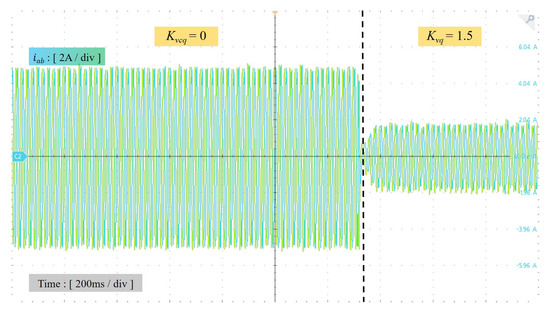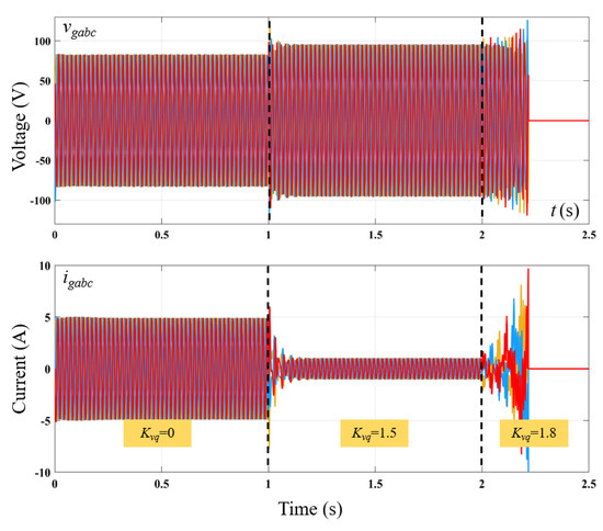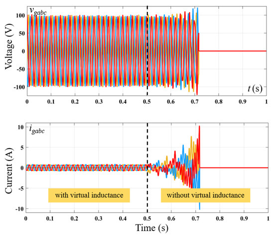 Figure 15 shows the waveform variations of the voltage at the PCC () and the output current of the STATCOM () before and after adding virtual impedance control to the STATCOM grid-connected system. By comparing with the results after removing the virtual impedance control (), it is evident that, upon introducing the virtual impedance control into the STATCOM with the droop coefficient , the three-phase waveforms of the voltage at the PCC () and the output current () remain balanced, the system remains stable, and operates as intended. After removing the virtual inductor, the system becomes unstable and the output current increases significantly.