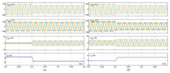 Figure 17a,b both demonstrate grid voltage sag conditions in the phase voltages, with amplitude reductions from 100 V to 80 V. However, the system responses exhibit significant divergence due to the distinct control strategies. A comparative analysis of the waveforms reveals that the proposed methodology inherently provides voltage support: even prior to the voltage sag event, the phase voltage amplitude at the PCC in Figure 17a maintains closer proximity to the rated 100 V nominal value. This discrepancy becomes markedly pronounced post-sag, as evidenced by the synchronous voltage collapse of in Figure 17b under conventional control.