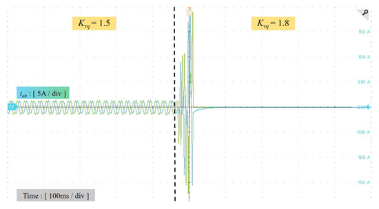 Figure 19 and Figure 20 show the STATCOM current waveforms without virtual inductors for varying droop control parameters. Figure 11 shows that, when , the current decreases to provide additional reactive power, maintaining system stability. As shown in Figure 20, when , the output current does not decrease further as in Figure 19. Instead, it increases significantly, indicating system instability. This result aligns with expectations and previous theories and simulations.