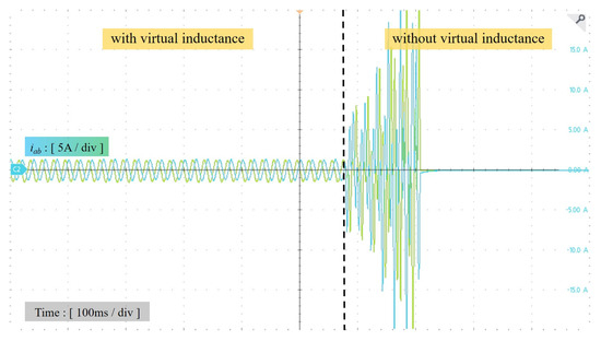 After adding the virtual inductor, STATCOM stability is enhanced, as illustrated in Figure 21. With set to 1.8 (as in Figure 20), the system remains stable. However, removing the virtual inductor control method causes the output current to increase significantly and the system to become unstable.