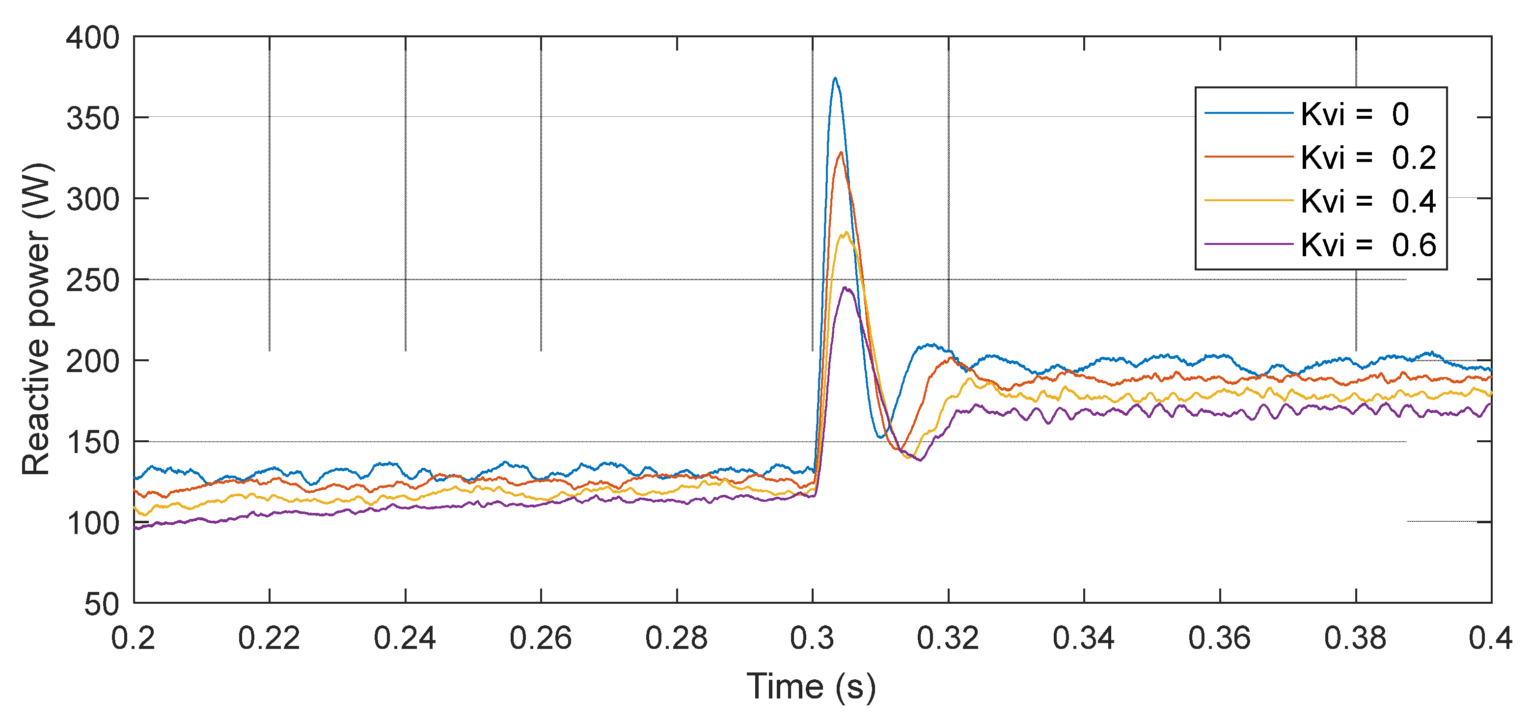 The enhancement of stability is achieved at the expense of reduced reactive power support capability. To demonstrate this phenomenon, multiple simulations are conducted by varying values under the condition of (where the system remains stable without virtual inductance implementation). To further investigate the impact of virtual impedance on dynamic performance, the transient response of reactive power variation caused by the increment is specifically captured, as shown in Figure 16.