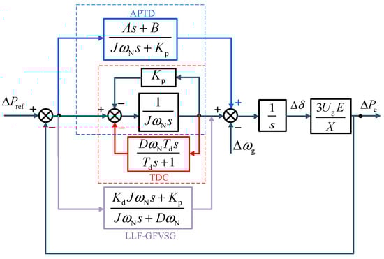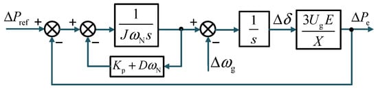 where X is the equivalent line impedance (X = ωLg), δ denotes the phase difference between the VSG output voltage and the grid voltage, and ωg represents the grid angular frequency. Neglecting the influence of the voltage and current inner loops, the small-signal block diagram of the P-f closed-loop system is derived as shown in Figure 3.