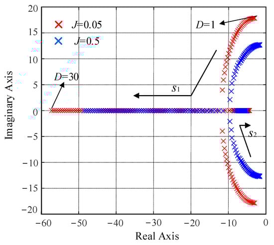Figure 4 shows the eigenvalue loci of the VSG active power control loop. With fixed J, increasing D converts a pair of complex conjugate poles into two negative real poles, transitioning the system from an underdamped to an overdamped state, thereby effectively suppressing power oscillations. Conversely, as J increases, the conjugate poles shift toward the imaginary axis, potentially inducing low-frequency oscillations.