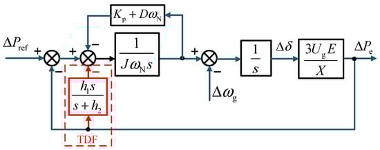 The coefficient matrix in Equation (7) demonstrates that the feedback gain h1 directly increases the system’s equivalent damping ratio, effectively suppressing the power oscillations. From Figure 5, the small-signal closed-loop transfer function of the transient damping-enhanced VSG active power loop is derived as