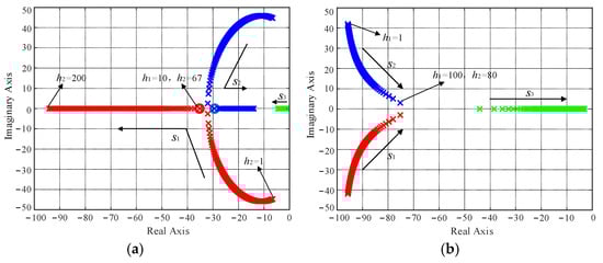 Root locus of the TDF-VSG closed-loop control system: (a) h1 = 10 with h2 varying from 1 to 200. (b) h2 = 80 with h1 varying from 1 to 100.