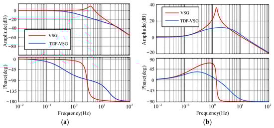 Frequency response comparison between VSG and TDF-VSG: (a) ΔPe/ΔPref. (b) ΔPe/Δωg.