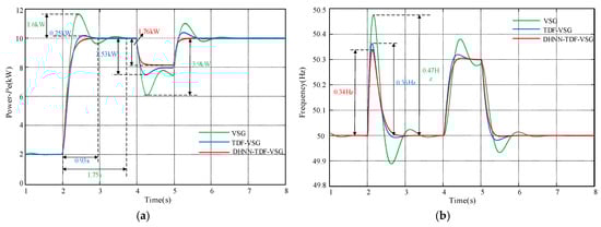 To validate the effectiveness of the control strategy, this paper presents a comparative analysis of the active power response characteristics among VSG, TDF-VSG, and DHNN-TDF-VSG, with simulation results shown in Figure 10.