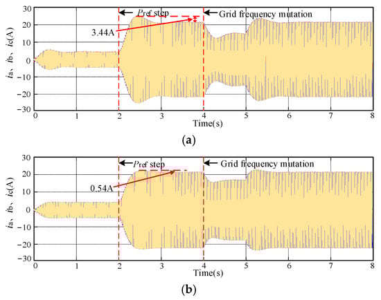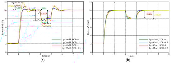 Figure 13a presents simulation results of the TDF-VSG control strategy under different SCR conditions. When SCR = 4 and 1.5, the active power overshoots are 0.35 kW and 0.19 kW, respectively, with steady-state errors of 2.4 kW and 2.52 kW. For SCR = 1, the overshoot increases to 0.86 kW with a steady-state error of 3.28 kW. Under the extreme condition of SCR = 0.5, the overshoot and steady-state errors further escalate to 1.75 kW and 3.93 kW, respectively. These results demonstrate that the fixed-parameter TDF-VSG control exhibits poor adaptability to grid impedance variations, failing to effectively improve both the dynamic and steady-state performance.