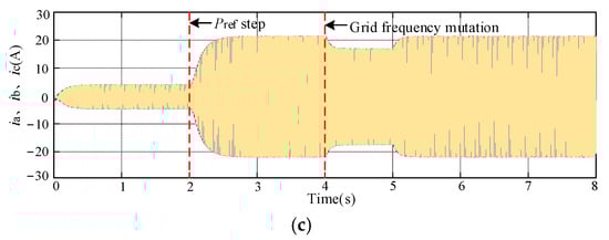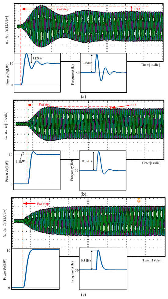 Figure 15 shows the comparison of the output active power, frequency, and output current waveforms under different control strategies when Pref undergoes a step change. It can be observed from the figure that the experimental results are consistent with the simulation results under the condition of an active power reference step change. Compared with the VSG control, the TDF-VSG control strategy can effectively suppress transient power oscillations and frequency fluctuations, reducing the overshoot of the output current by 5.3 A. Furthermore, the DHNN-TDF-VSG control strategy further suppresses low-frequency oscillations on this basis, with no overshoot in the output active power, thereby verifying the effectiveness of the proposed control strategy in this paper.