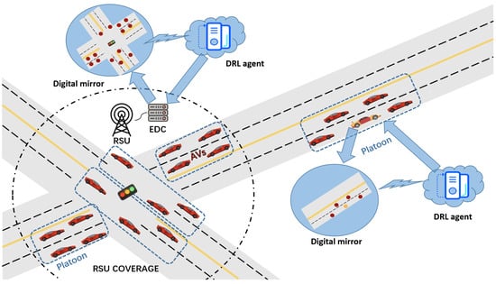 The twin digital layer supplements the layer of physical entities [19]. Each AV has a corresponding digital twin (DT) deployed on the connected ECD. The DT, acting as a virtual replica of the physical AV, continuously gathers real-time information about the vehicle, such as speed, direction, and computational resource status. This information is utilized to precisely simulate the vehicle’s state in the virtual environment. DTs play a crucial role in decision-making. They interact with each other on the virtual network to optimize driving strategies for physical AVs [20]. When a vehicle in a platoon experiences a sudden change in speed or direction, its DT promptly updates the virtual model and shares the updated information with other DTs. Through such interactions, DTs can jointly re-evaluate driving decisions, such as adjusting task allocation among vehicles, ensuring that the platoon can adapt to changes in the driving environment in a timely manner and maintain its stability and safety [21,22].