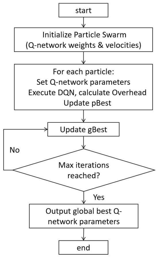 To provide a more intuitive understanding of the algorithm’s workflow, we include a flowchart in Figure 2. The flowchart visually depicts the key operations of the algorithm. Starting from the initialization of the particle swarm, it shows how each particle’s Q-network parameters are utilized to execute DQN, calculate the overhead, and update the personal best. Subsequently, the global best is updated, and the process repeats until the maximum number of iterations is reached. At that point, the optimal Q-network parameters are outputted. The PSO-DQN hybrid algorithm leverages the exploration capabilities of PSO and the learning ability of DQN. PSO helps in efficiently searching the vast parameter space of the Q-network, while DQN provides a mechanism to learn optimal resource allocation policies based on the environment’s feedback. This synergy enables the algorithm to converge to better solutions compared to using either algorithm alone.