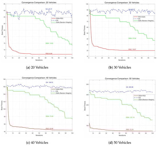 As can be clearly observed from Figure 3, the DQN+PSO configuration (the red curve) demonstrates relatively excellent performance in terms of both convergence speed and the quality of the final optimal solution. It is able to converge to a relatively low optimal fitness value within a small number of iterations. For example, in the case of 20 vehicles (Figure 3a), the final optimal fitness value of the DQN+PSO configuration is 6.54, which is significantly lower than that of the baseline DQN (Random Weights).