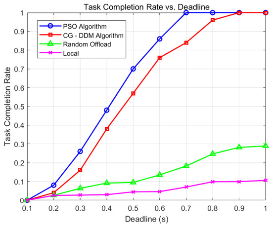 As depicted in Figure 5, the PSO algorithm exhibits a remarkable edge in the task completion rate. With the extension of the deadline, its task completion rate experiences a rapid upswing, approaching 1 when the deadline reaches approximately 0.7 s. This clearly indicates that the PSO algorithm can efficiently allocate computing resources, ensuring that a large number of tasks are successfully completed within the specified time frame. In contrast, although the CG-DDM algorithm also demonstrates a relatively satisfactory performance, its growth rate of the task completion rate is notably slower than that of the PSO algorithm. It gradually gets closer to 1 as the deadline increases, yet lags behind the PSO algorithm in the early stage of deadline extension. The Random Offload strategy, on the other hand, has a significantly lower task completion rate compared to the aforementioned algorithms. Even when the deadline is stretched to 1 s, its task completion rate merely reaches around 0.3, highlighting that random resource allocation is not an efficient approach for handling time-constrained tasks. The local execution approach fares the worst among all the methods, as it predominantly relies on local computing resources. These resources may be insufficient to handle numerous tasks within a limited time, leading to a low completion rate even with a relatively long deadline. Overall, the PSO algorithm outperforms other methods in terms of the task completion rate, underscoring its effectiveness in optimizing resource allocation for task execution under deadline constraints.