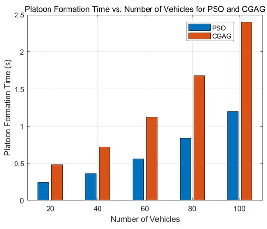 The Figure 6 shows the variation of the platoon formation time of the PSO algorithm and the CGAG algorithm with the number of vehicles. As the number of vehicles increases from 20 to 100, the platoon formation time of the PSO algorithm remains stable overall. When there are 20 vehicles, it is at a relatively low level, and the subsequent growth is gentle. This is because it mimics the behavior of flocks of birds or schools of fish, enabling it to quickly find good platoon strategies and reduce the coordination time among vehicles, and thus has strong adaptability.