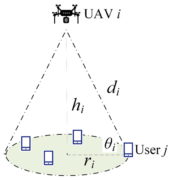 (2) We assume that the UAVs follow a uniform distribution in the horizontal plane, while all of the UAVs are at the same altitude. The density of users is denoted as , and hence, the number of users can be expressed as , where A is the area of the whole region. Moreover, the set of users is denoted as .